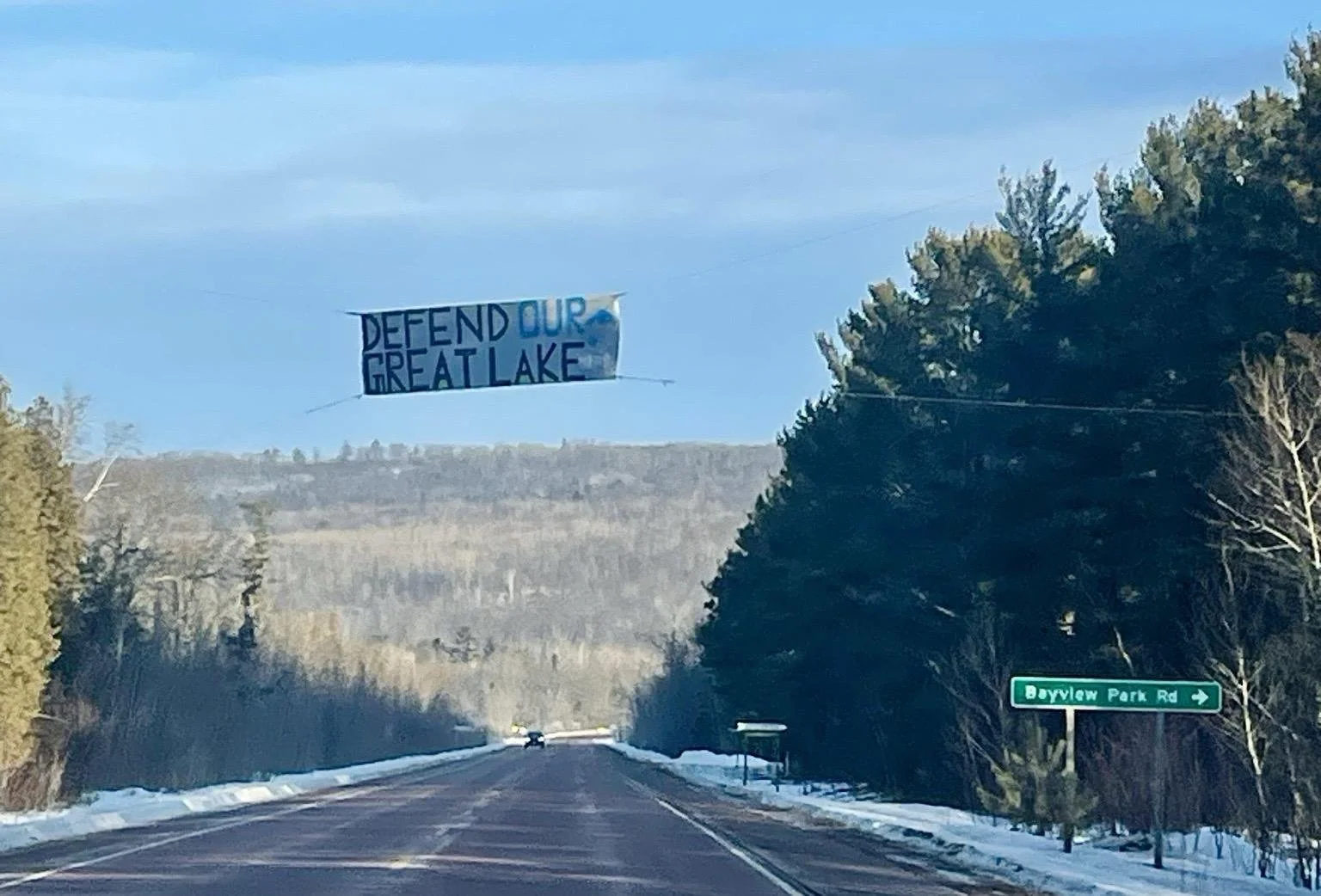 The Feb. 26 post frames the moment as a transition from permitting to an active mobilization window. The immediate trigger is described as an administrative law judge’s announcement to uphold Wisconsin DNR permits for the Line 5 project segment. In response, an anonymous actor reportedly conducted a low-risk, high-visibility action: a banner hung over Highway 13 between Washburn and Bayfield with messaging on each side, “Defend our great lake” and “All pipelines break.” The accompanying photo description (snowy ground, forested area) suggests winter conditions and a roadside overpass placement consistent with attention-seeking propaganda rather than direct sabotage.